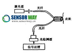 發(fā)光頻率為f的激光經(jīng)透鏡,光纖被送到表皮組織。對于不動的組織,例如血管壁,所反射的光不產(chǎn)生頻移;而對于皮層毛細(xì)血管里流速為 的紅細(xì)胞,反射光要產(chǎn)生頻移,其頻率變化為△f;發(fā)生頻移的反射光強度與紅細(xì)胞的濃度成比例,頻率的變化值可與紅細(xì)胞的運動速度成正比。發(fā)射光經(jīng)光纖收集后,先在光檢測器上進行混頻,然后進人信號處理儀,從而得到紅細(xì)胞的運動速度和濃度。