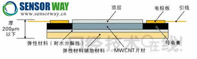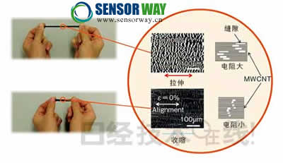 這種傳感器的開發(fā)源于鈴木到靜岡大學(xué)從事碳納米管(CNT)研究。其中重要的研究就是多層管結(jié)構(gòu)“MWCNT(multi wall CNT)”。普通CNT的長度為μm級(jí),呈粉末狀或分散液狀態(tài),而靜岡大學(xué)開發(fā)的MWCNT長度為mm級(jí),呈長纖維狀。MWCNT在基板上生長到足夠大以后,用鑷子等工具對(duì)其進(jìn)行拉伸,可以將MWCNT作為片材取出。
